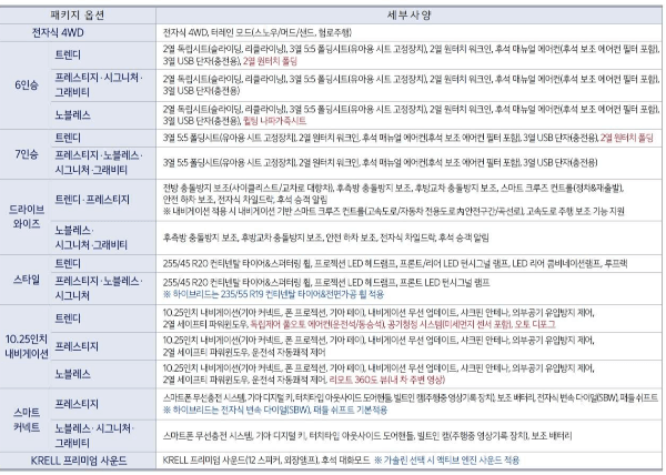 다양한 트림 옵션으로 선택할 수 있는데, 프레스티지, 노블레스, 시그니처, 그래비티 등 총 4가지 트림으로 구성되어 있습니다. 각 트림마다 다양한 옵션과 기능을 제공하므로 자신에게 맞는 모델을 선택할 수 있습니다.
