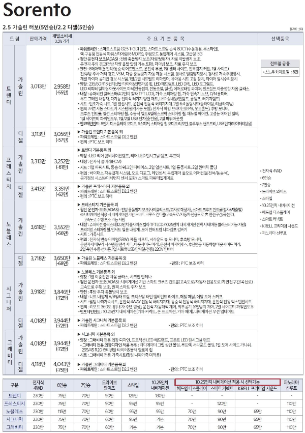 - 쏘렌토 2.5 가솔린: 3,150만 원 ~ 4,150만 원