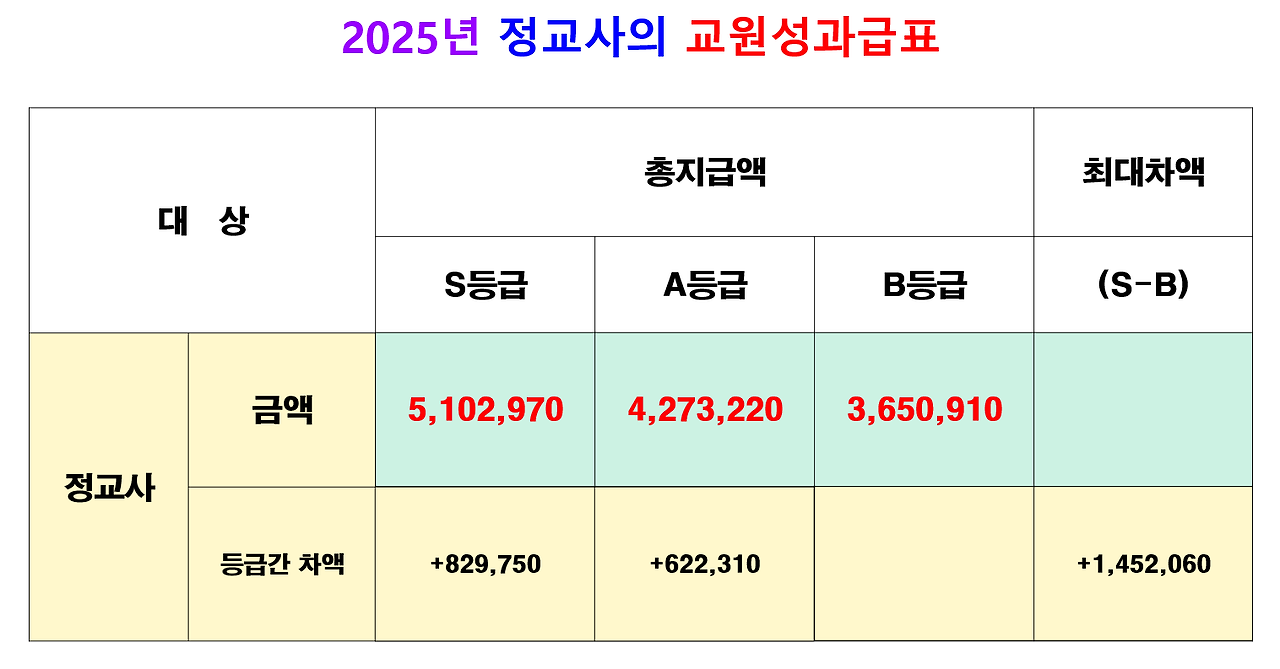 이번 인상은 단순한 금액 증액뿐만 아니라, 교육계 전반에 걸쳐 교원의 사기 진작과 교육의 질 향상을 위한 긍정적 영향을 기대할 수 있습니다. 특히, S등급과 B등급 간의 차이가 140만 원 이상으로 나타남에 따라, 교사들이 스스로의 역량 개발과 교육 현장에서의 성과 향상을 위해 노력하게 되는 계기가 될 것입니다.