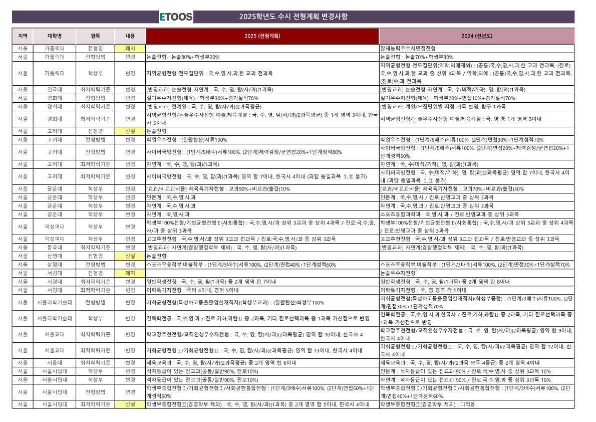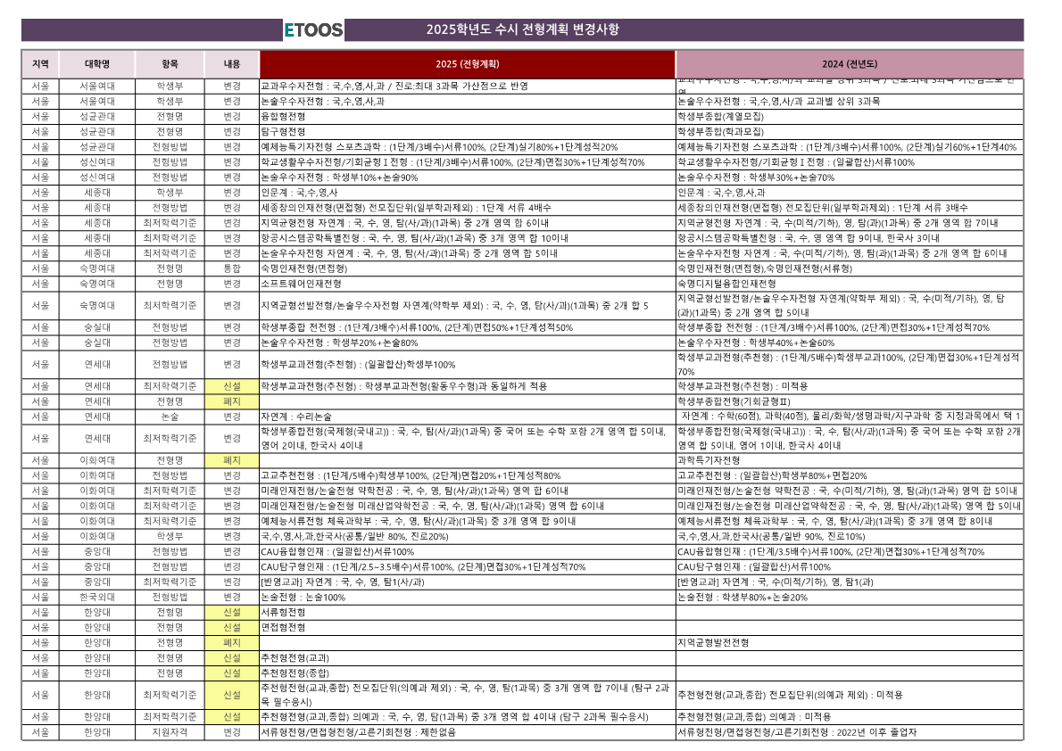 - 서울여대: 논술전형의 변경사항으로 학생부 반영 비율이 감소하고, 논술 비중이 증가했습니다.