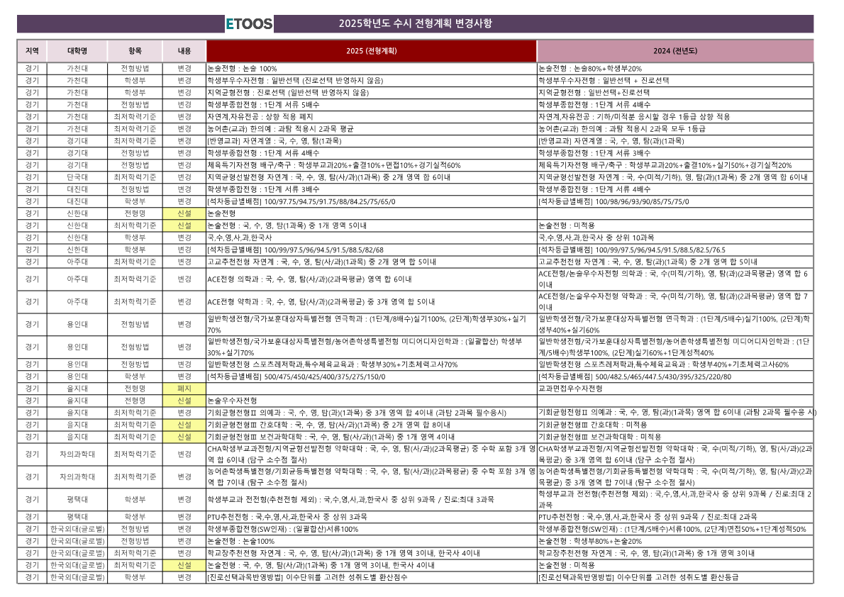 경기 지역 대학의 수시 전형 변경사항