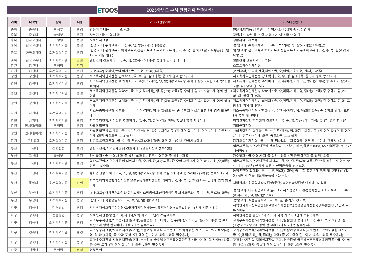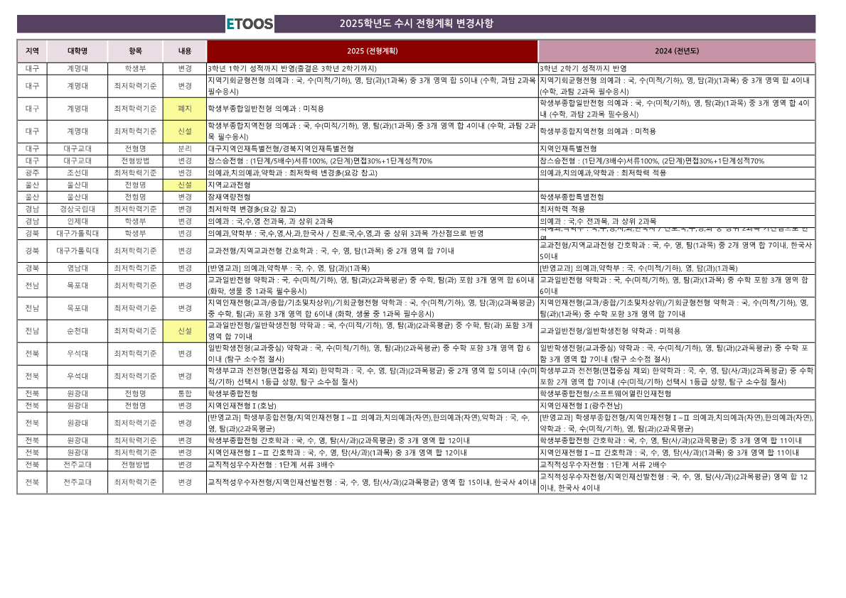 2025학년도 수시모집 전형 일정과 관련하여, 여러 대학의 전형 계획이 변경되었습니다. 다음은 주요 변경사항에 대한 요약입니다: