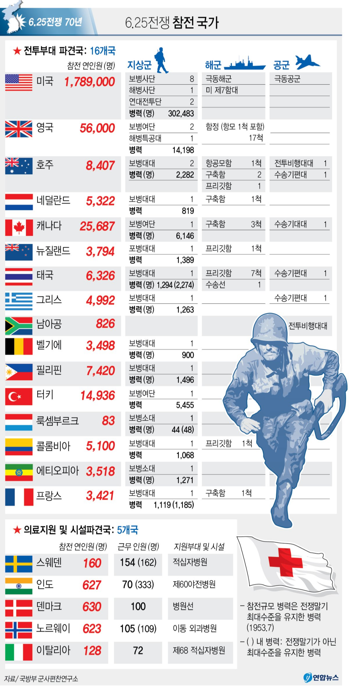 유엔군 625 전쟁 참전국 22개국 파병 병력 및 사망자 수