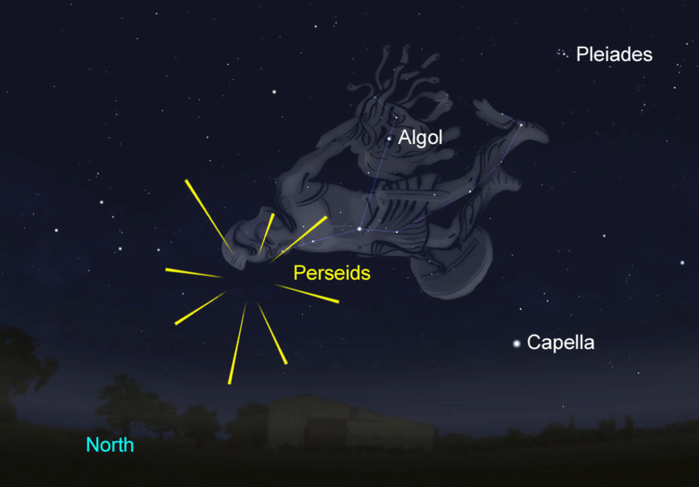 페르세우스 유성우의 복사점은 페르세우스 별자리 부근으로, 북쪽에서 북동쪽 사이에 위치합니다. 복사점은 유성우가 쏟아져 내려오는 시작점으로 볼 수 있습니다.