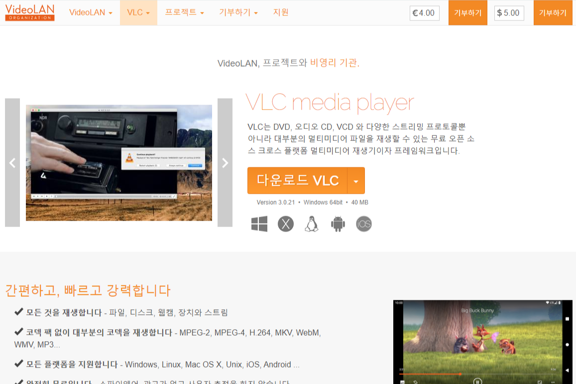 - VLC 다운로드 페이지에서 최신 버전을 다운로드 후 설치합니다.