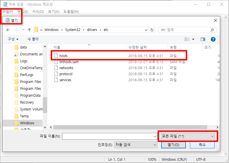 C:\Windows\System32\drivers\etc로 입력합니다. - 파일 형식에서 “모든 파일 (.)”을 선택합니다.