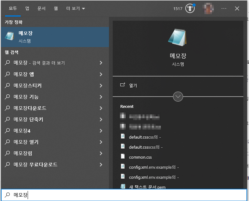 - 검색 결과에서 메모장을 마우스 오른쪽 버튼으로 클릭하고, "관리자 권한으로 실행"을 선택합니다.
