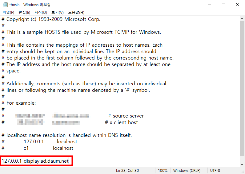 127.0.0.1 display.ad.daum.net - 이 줄을 입력한 후, 파일 > 저장을 클릭하여 변경 사항을 저장합니다.