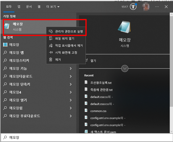 이렇게 하면 메모장이 관리자 권한으로 실행되어 시스템 파일을 수정할 수 있습니다.