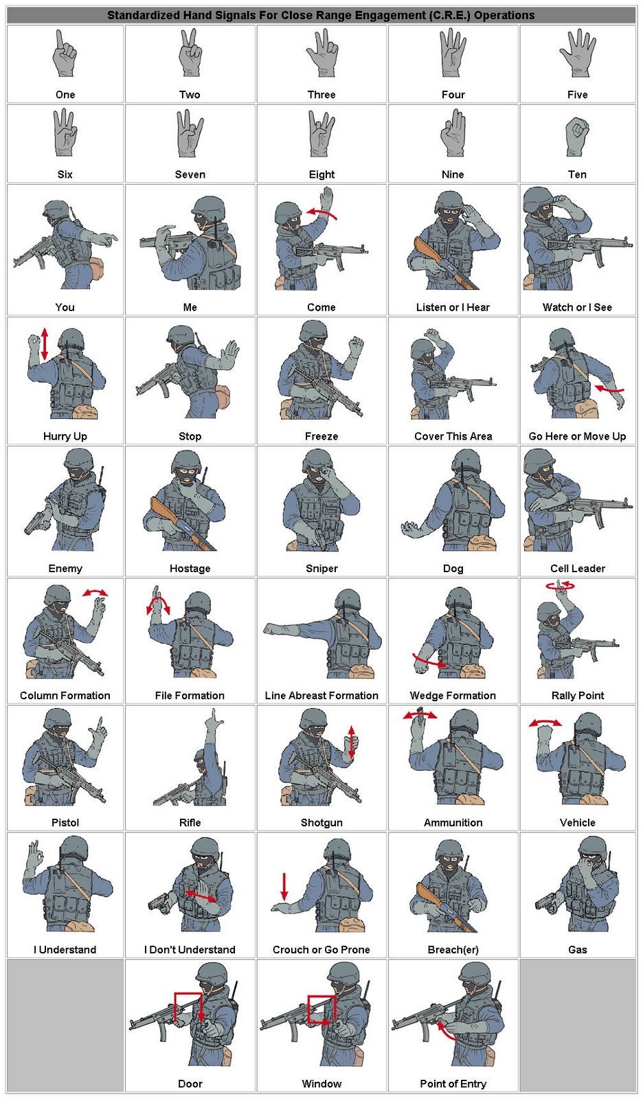 다양한 상황에서 사용되는 SWAT 수신호 중 일부를 살펴보겠습니다. 이러한 수신호들은 각각 특정한 의미와 목적을 가지고 있습니다.