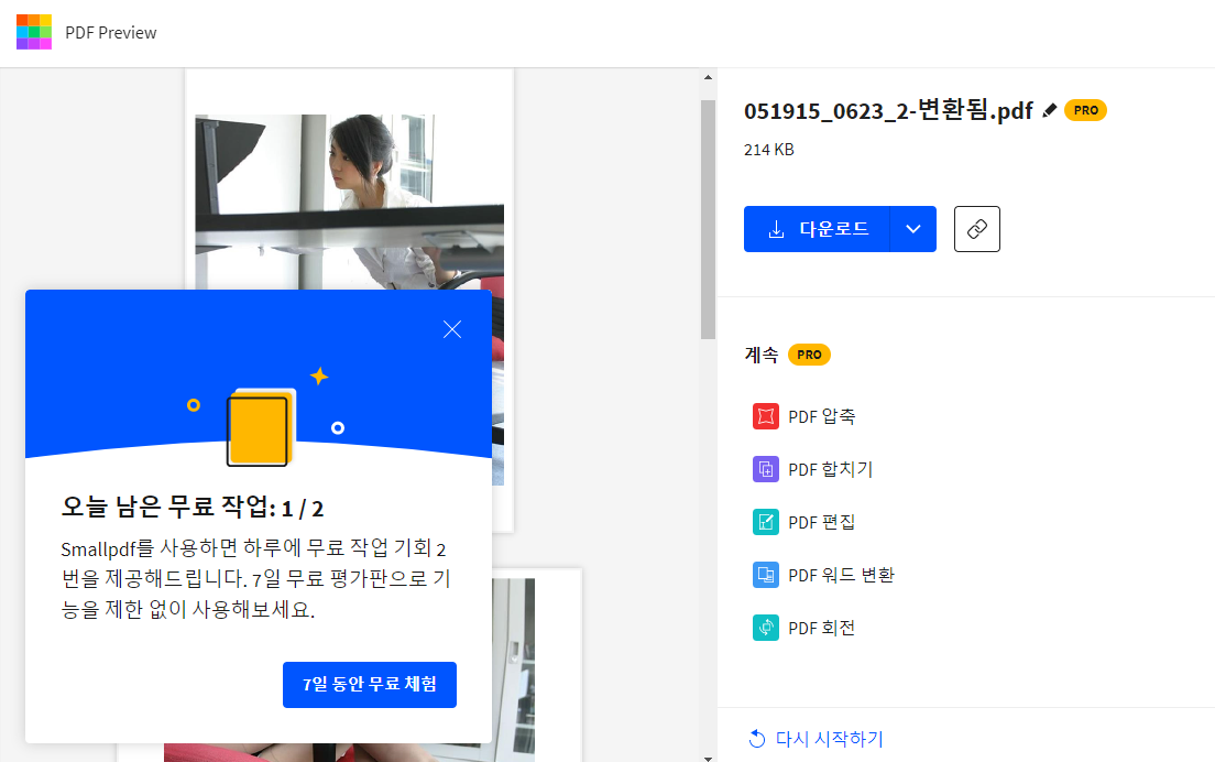SmallPDF의 다양한 기능을 무료로 이용할 수 있는 기회는 하루에 두 번으로 제한됩니다. 이를 초과하여 작업을 수행하고자 할 경우 유료 플랜을 구독해야 합니다. 그러나 SmallPDF는 7일 동안 무료로 모든 기능을 체험할 수 있는 무료 평가판을 제공하고 있습니다. 이 기간 동안에는 무제한 작업을 수행할 수 있으므로 여러 작업을 해야 할 경우 이를 활용하는 것이 좋습니다.