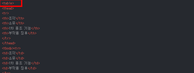 <thead>→<tbody>교체 - 또는 마크다운 원본에서 표 첫 줄 복사 → 구분선(