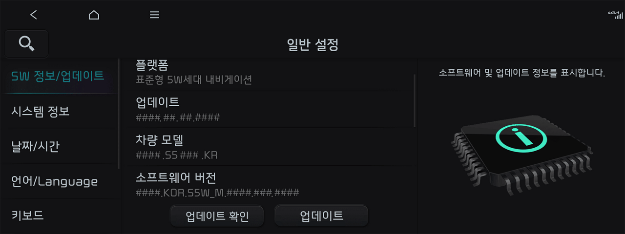 - 일반 설정 화면에서 "SW 정보/업데이트" 탭을 선택하고, "업데이트"를 선택하면 업데이트가 진행됩니다.