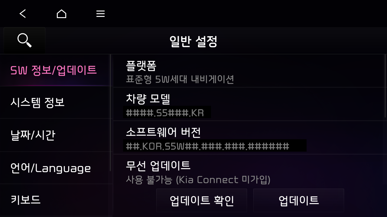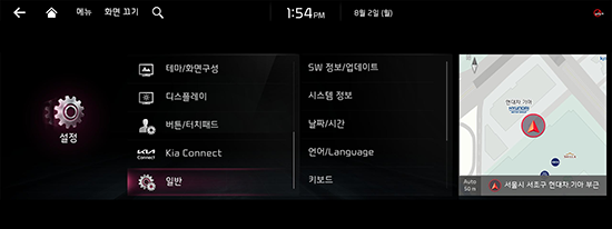 차량 내에서 내비게이션 시스템을 켜고, 전체 메뉴 화면에서 ‘설정’을 선택합니다. 이후 ‘일반’ 설정 화면으로 이동하여 ‘SW정보/업데이트’ 탭을 선택합니다.