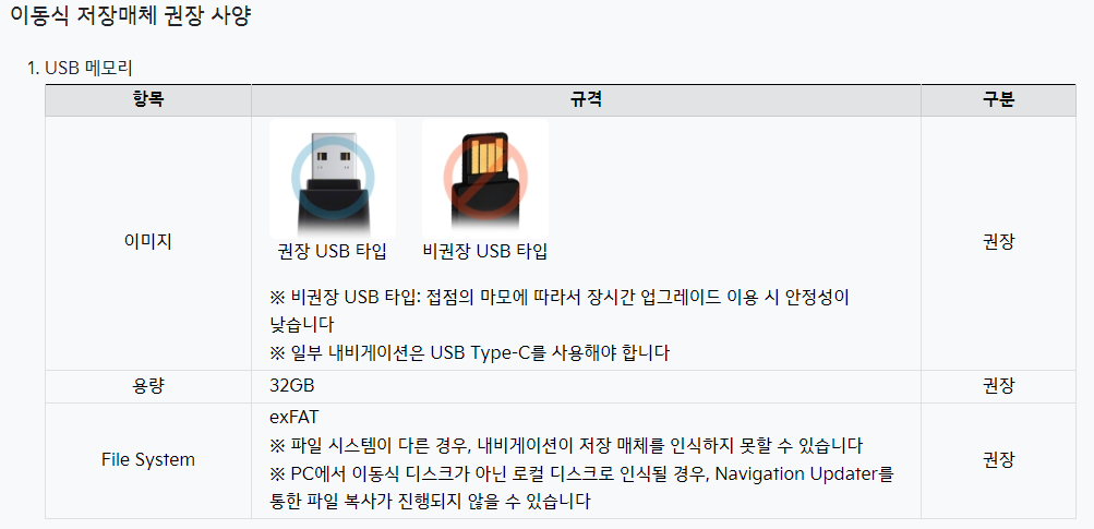 - USB 메모리 또는 SD카드를 업데이트 도중 분리하지 않도록 주의해야 하며, 특히 주행 중에는 업데이트를 진행하지 않는 것이 좋습니다.